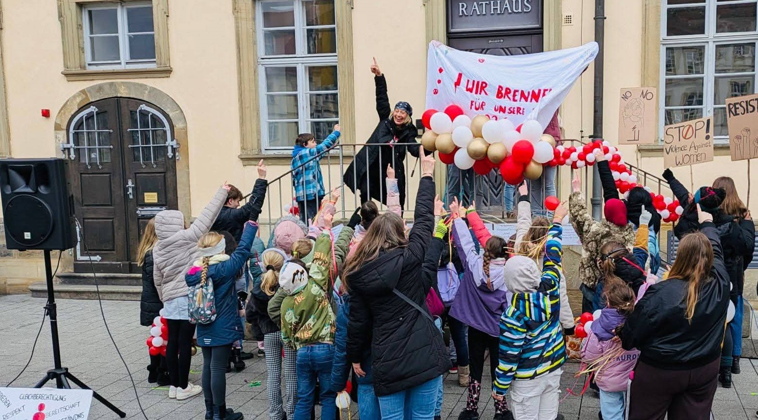 Seit 9 Jahren nehmen wir an der weltweiten Bewegung One Billion Rising in Bamberg teil – in diesem Jahr mit 45 Frauen, Männern, Mädchen und engagierten Jungen.